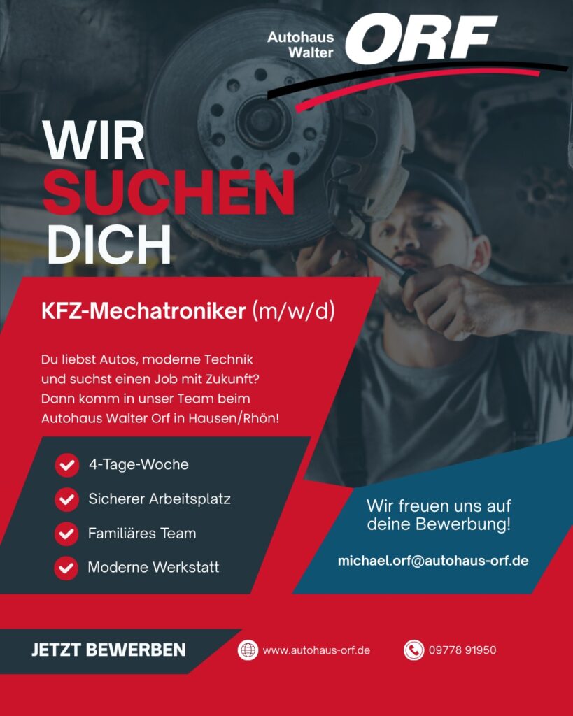Wir suchen motivierte Kfz-Mechatroniker (m/w/d) mit Leidenschaft für Technik, Teamgeist und Verantwortungsbewusstsein. Wenn Sie Ihr Handwerk lieben und ein Umfeld schätzen, in dem Menschlichkeit und Qualität zählen – dann bewerben Sie sich jetzt!